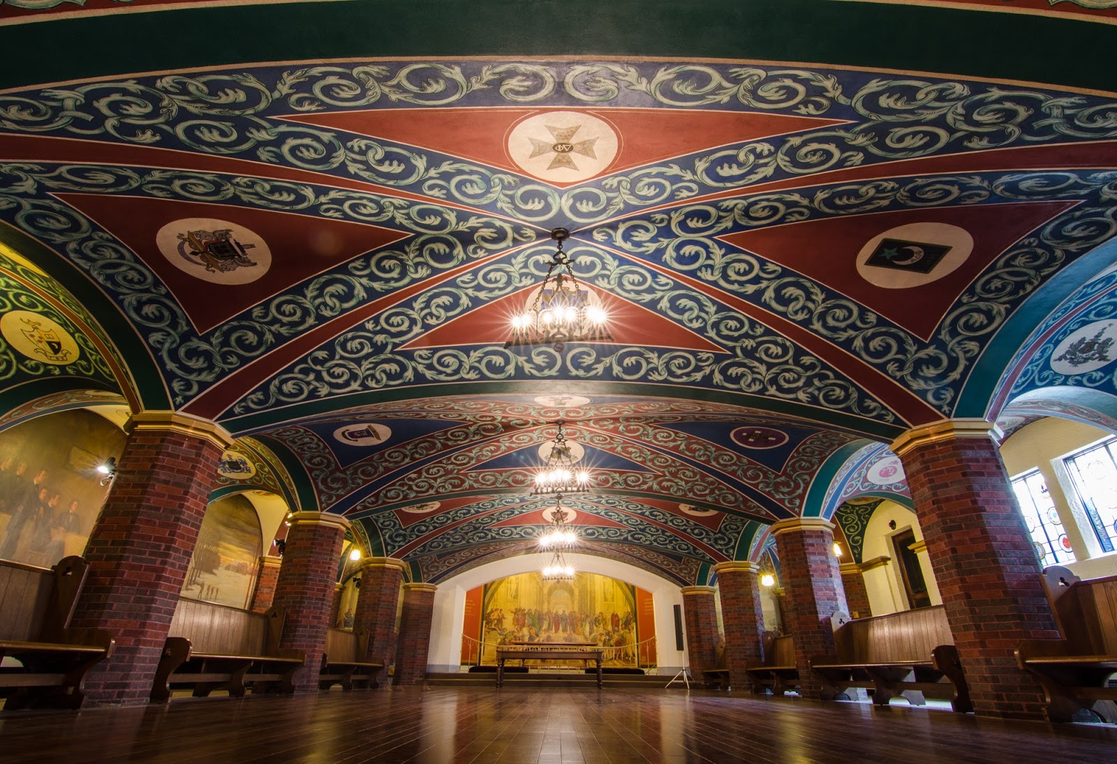 On the interior, the exposed black walnut beams of the chapel terminate in corbels, four on each side, which are carved with figures holding shields to represent different ages. The ceiling and the wall over the altar are adorned with murals. Flanking the altar mural are bronze tablets depicting kneeling angels holding wreaths.